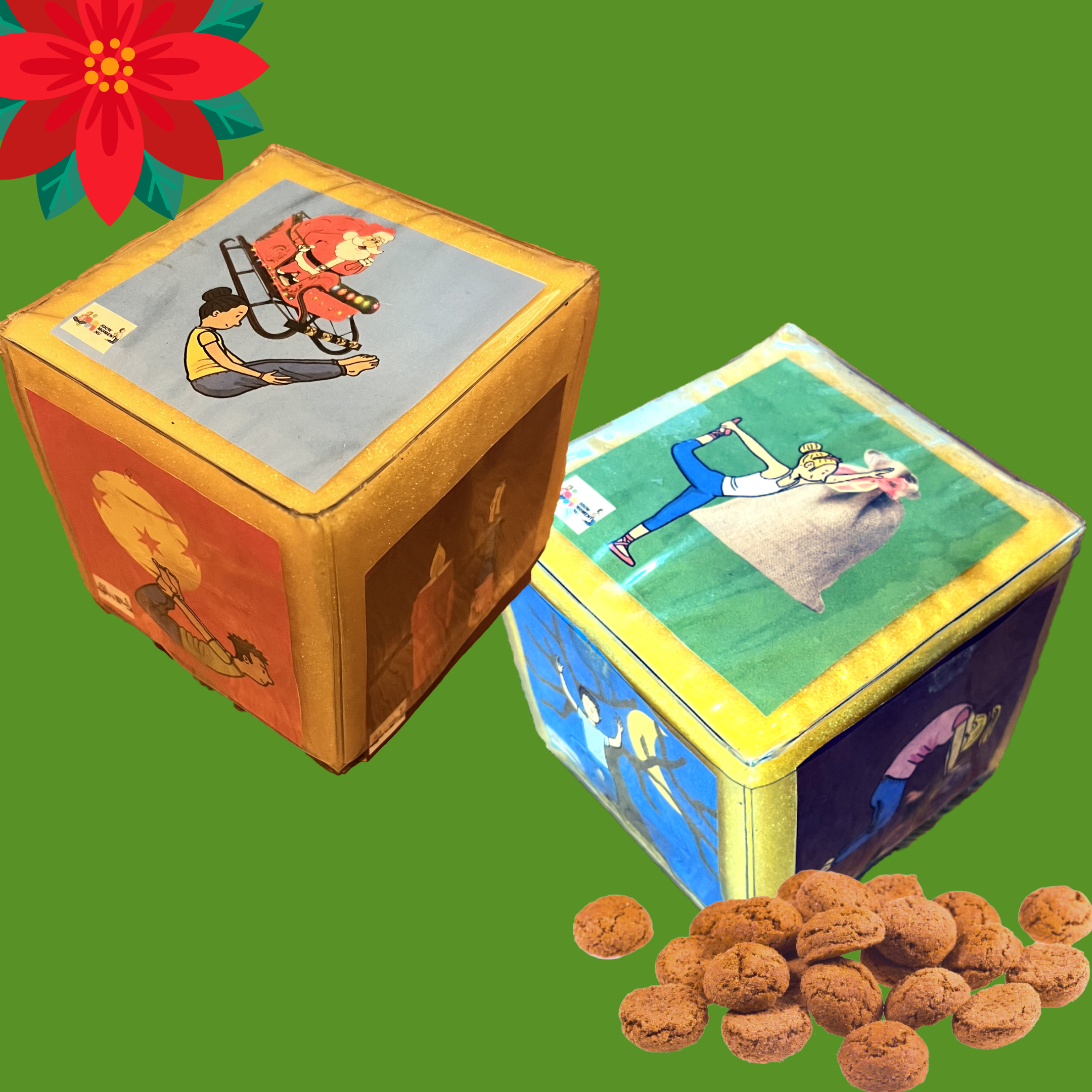 Yogales + voorleesversie, kerstyogaletters, kerstkubus, verhaal met yogahoudingen, massage en creatieve opdrachten.